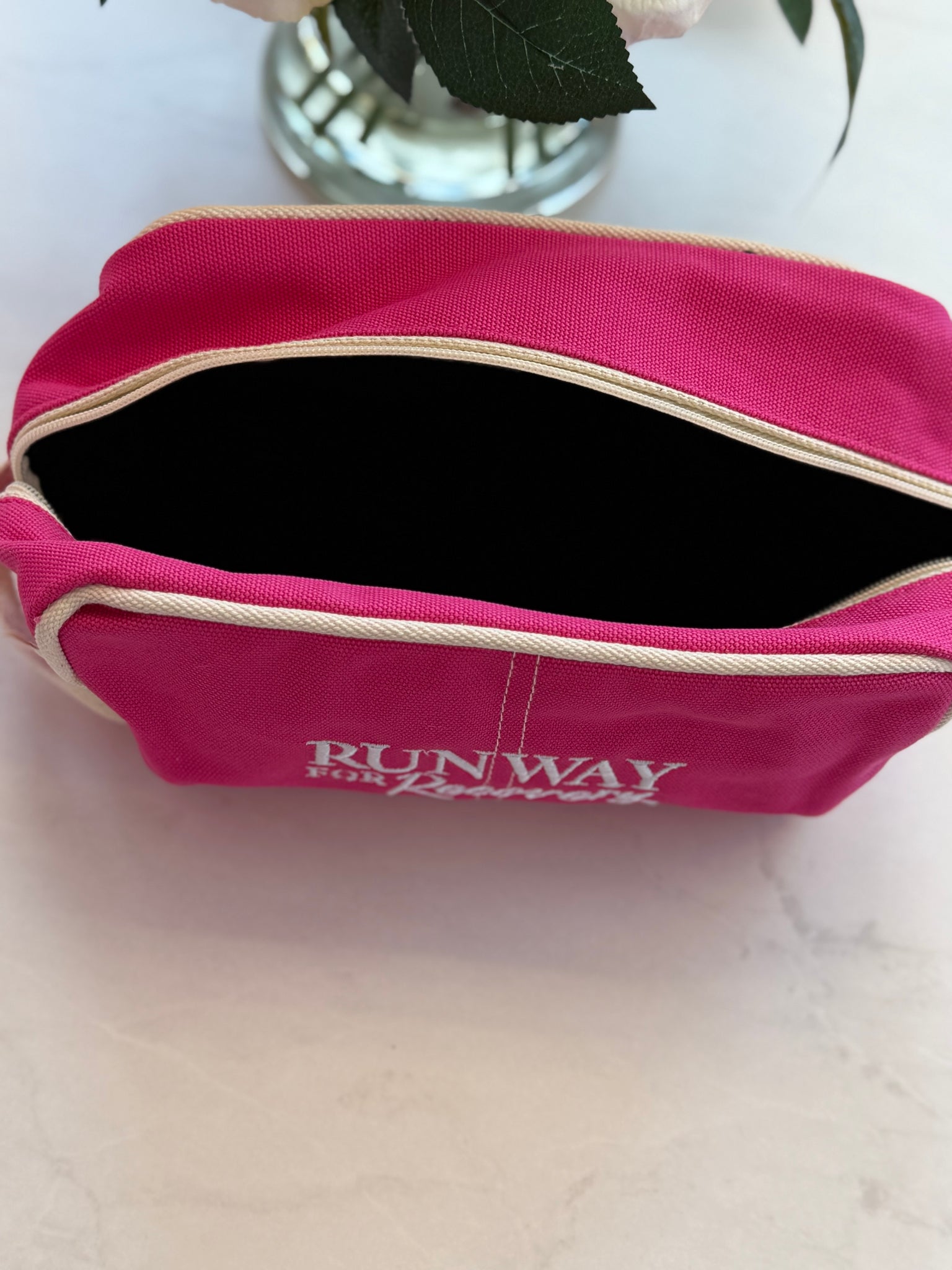 This fabric Dopp Kit is a necessity for quick or extended excursions. Featuring "Runway for Recovery" stitched on the front, it'll securely store all your essentials in one spot for effortless retrieval. And let's not forget - it's ideal for tossing in your bag while prepping for a modeling moment!